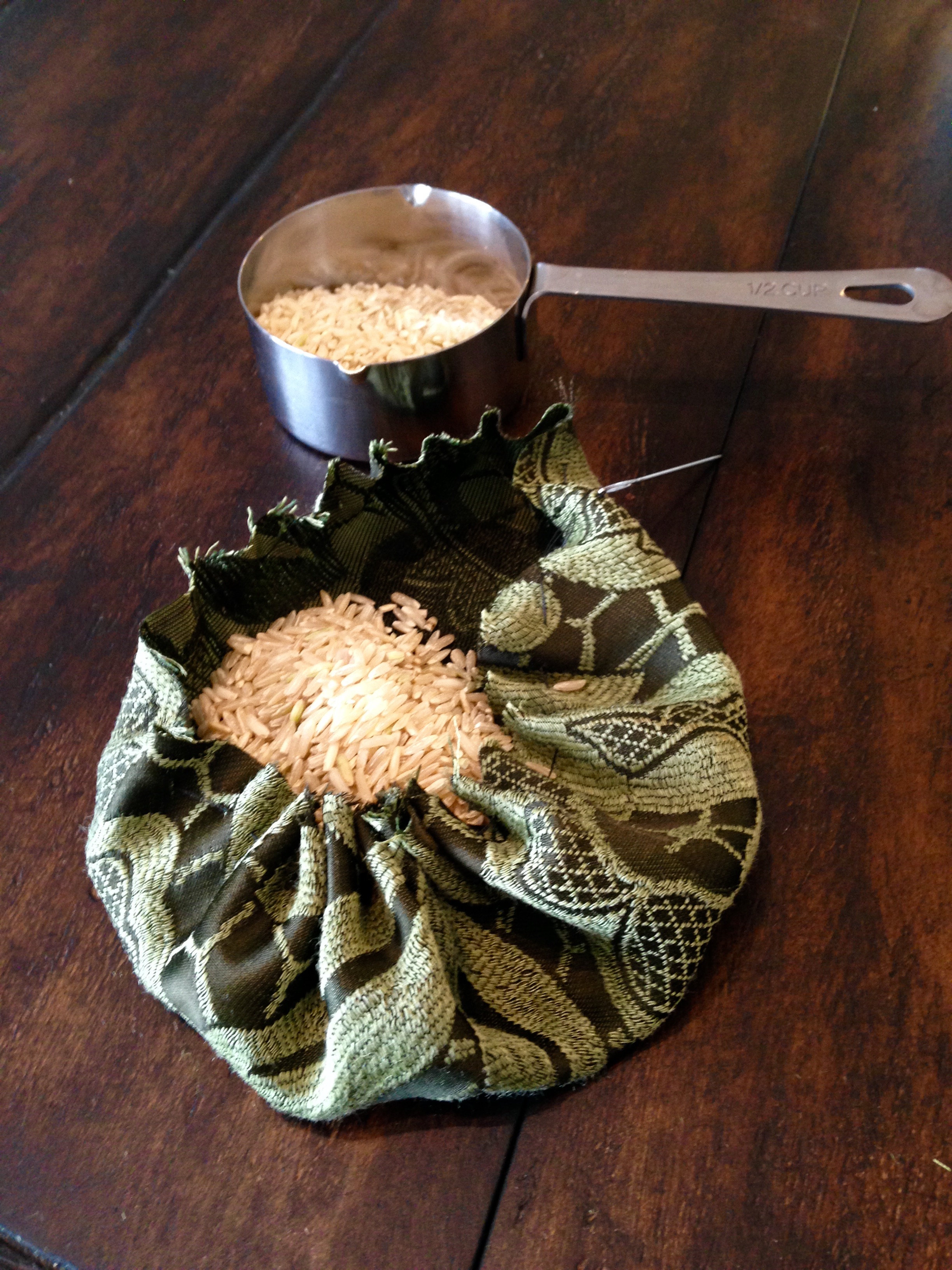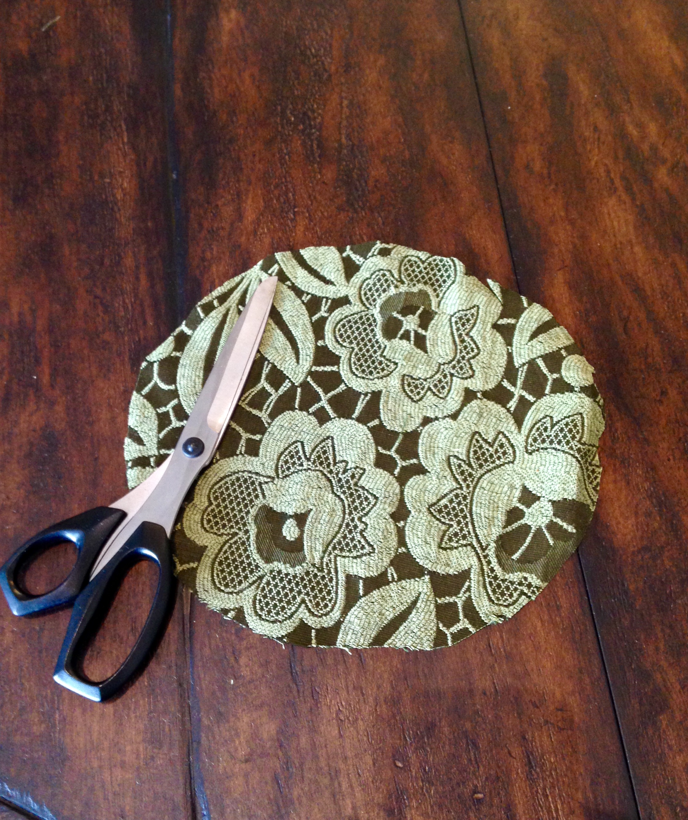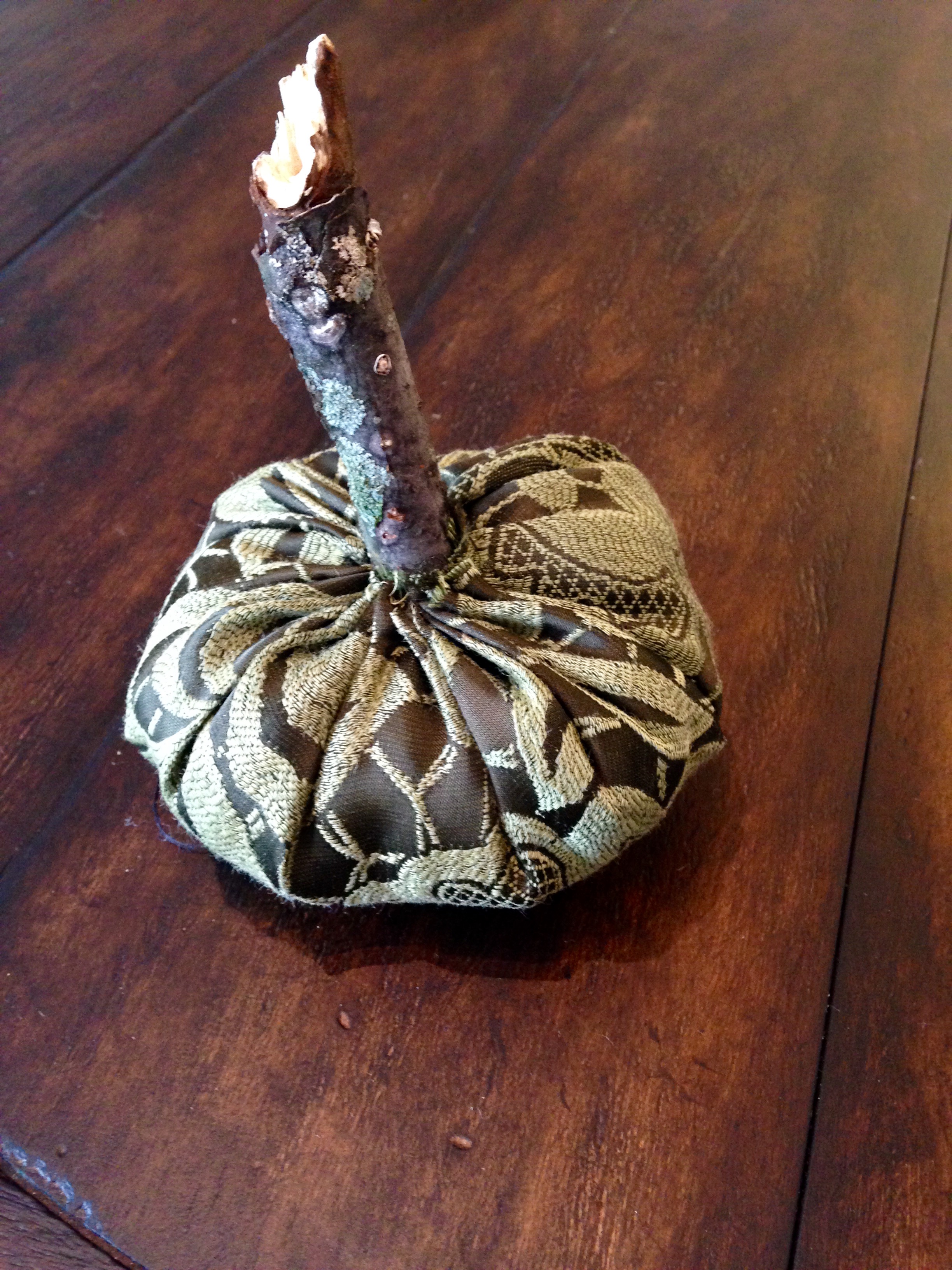 I’ve been wanting to make velvet pumpkins but didn’t want to spend $35 for a yard of velvet….so off to my local thrift store I went. I had no luck finding velvet but I did find a skirt made of a beautiful, deep green brocade. Price: $5.00. I’ll be able to make at least 2 or 3 pumpkins out of the skirt.