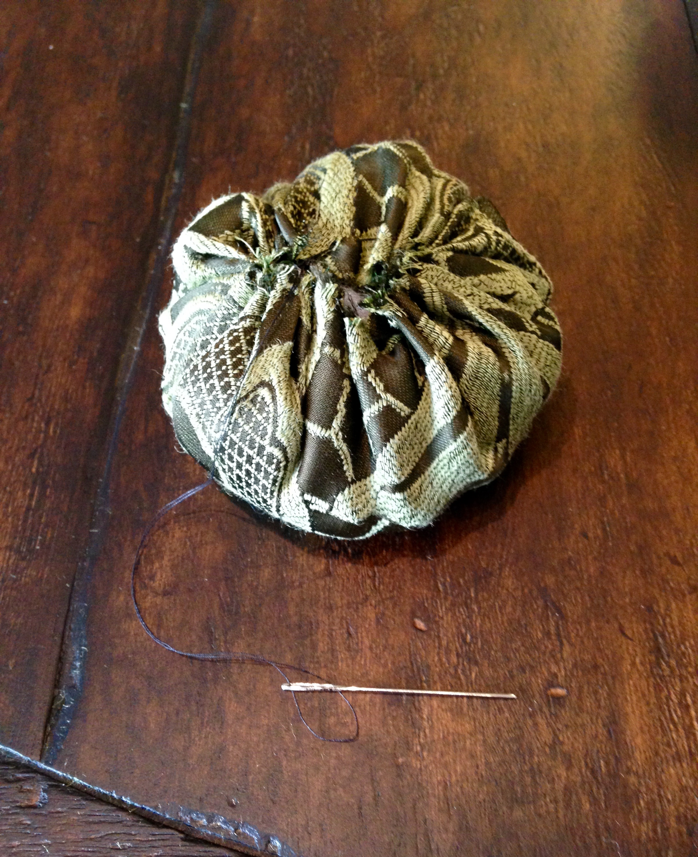 Now it’s time to pull the pumpkin closed and sew the top together. You can either insert the stem before you pull the pumpkin closed or glue it on after you close up the opening.