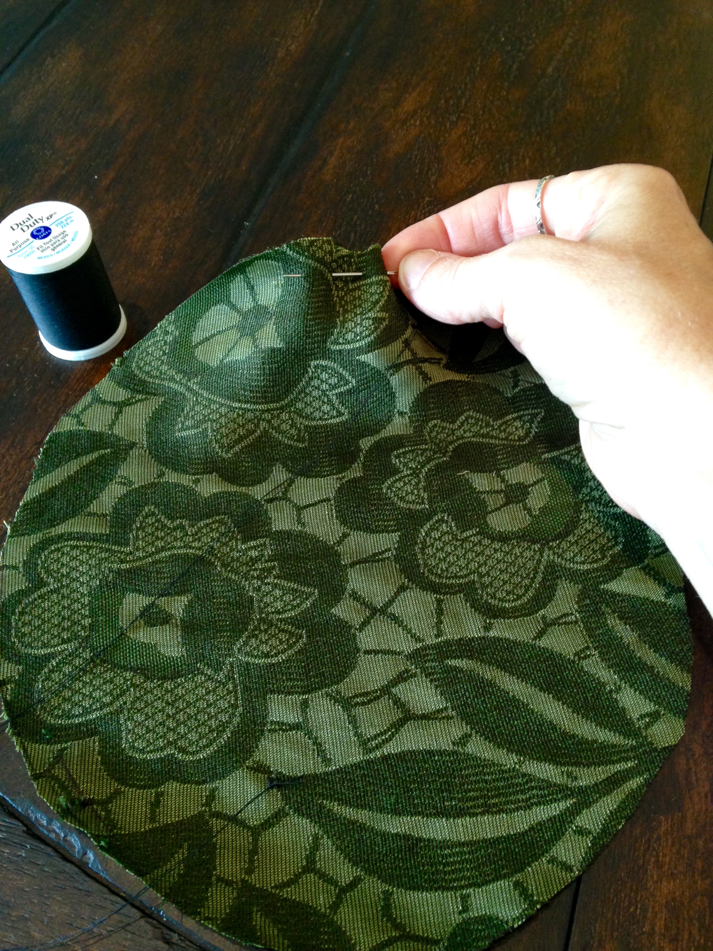 Knot the end of your needle and thread; sew around the edge of the circle about 1/4″ from the edge.